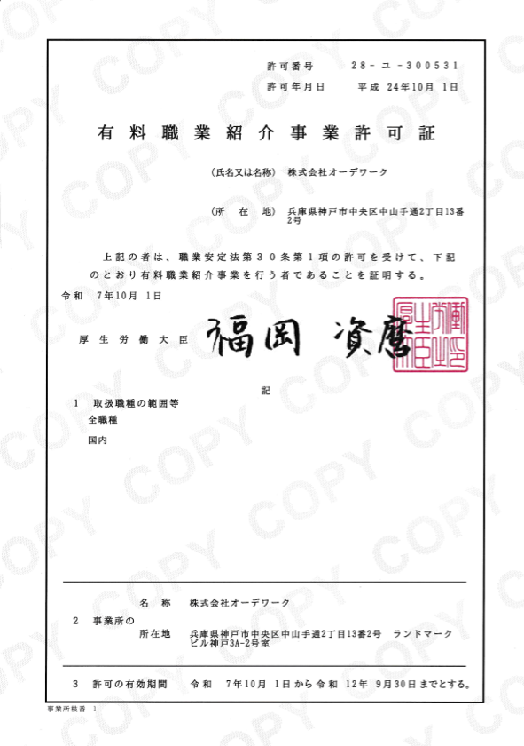 事業を行うには厚生労働大臣の許可を受ける必要があり、弊社は2012年10月1日に許可を取得しております。
