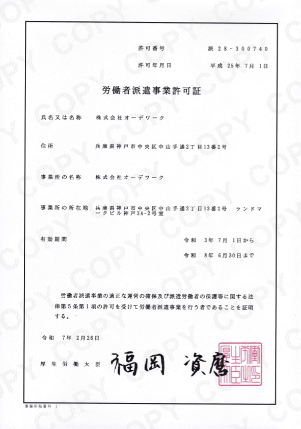 事業を行うには厚生労働大臣の許可を受ける必要があり、弊社は2013年7月1日に許可を取得しております。
